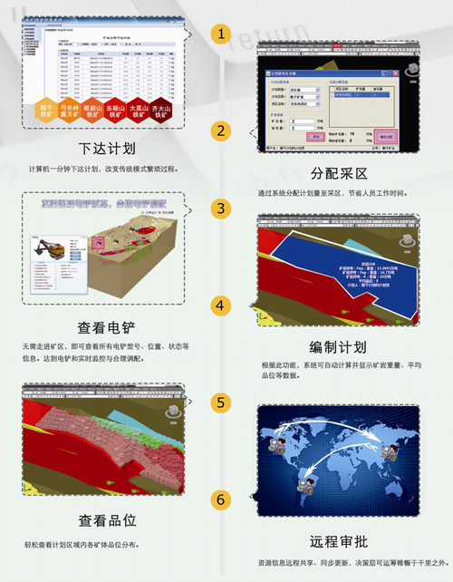 以三維實(shí)體模型為基礎(chǔ),結(jié)合采礦生成工藝流程,完成礦山生產(chǎn)年、季度、月份的采礦計(jì)劃編排,同時(shí)評(píng)價(jià)計(jì)劃過程中的質(zhì)量指標(biāo),實(shí)現(xiàn)從公司下達(dá)計(jì)劃、部門落實(shí)生產(chǎn)部位,計(jì)劃審批等全過程閉環(huán)管理,資源同步共享,數(shù)據(jù)實(shí)時(shí)更新。