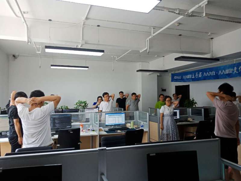 下午3點(diǎn)整,是聚進(jìn)科技沈陽(yáng)、鞍山、遼陽(yáng)、西安四個(gè)地方的團(tuán)隊(duì)集體運(yùn)動(dòng)時(shí)間。兩點(diǎn)半,各地公司內(nèi)秩序井然。三點(diǎn)整,音樂(lè)準(zhǔn)時(shí)響起,全體員工離開座位跟隨著各地的運(yùn)動(dòng)大使活動(dòng)起來(lái)。